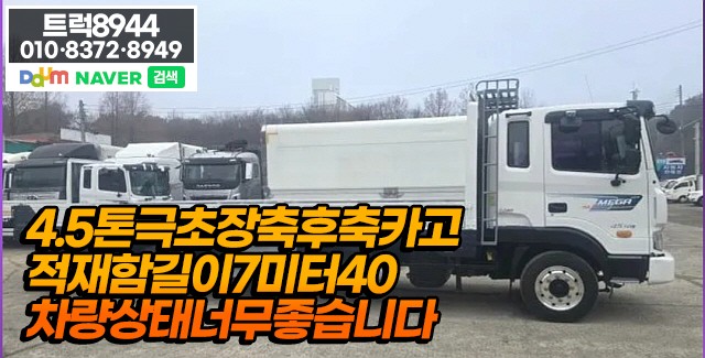 대표사진 사진1 사진2 사진3 사진4 사진5 사진6 사진7 사진8 사진9 등록유형 일반매물 구 분 팝니다 제작년월 2011년 4월 상 태 A+ 분 류 카고트럭/냉동차/탑차 > 15톤 이상 제작사 현대 모델명 4.5톤7m40 위 치 충북 상 호 트럭전문 가 격 2,700 만원 연락처 01083728949 엔 진 250 마력 톤 수 4.5 톤 밋 션 스틱 사고여부 운 행 270000 KM 할부/현금차 하부타입/상태 / % 장비소개 27만km후축바닥철판보강적재함길이7미터40